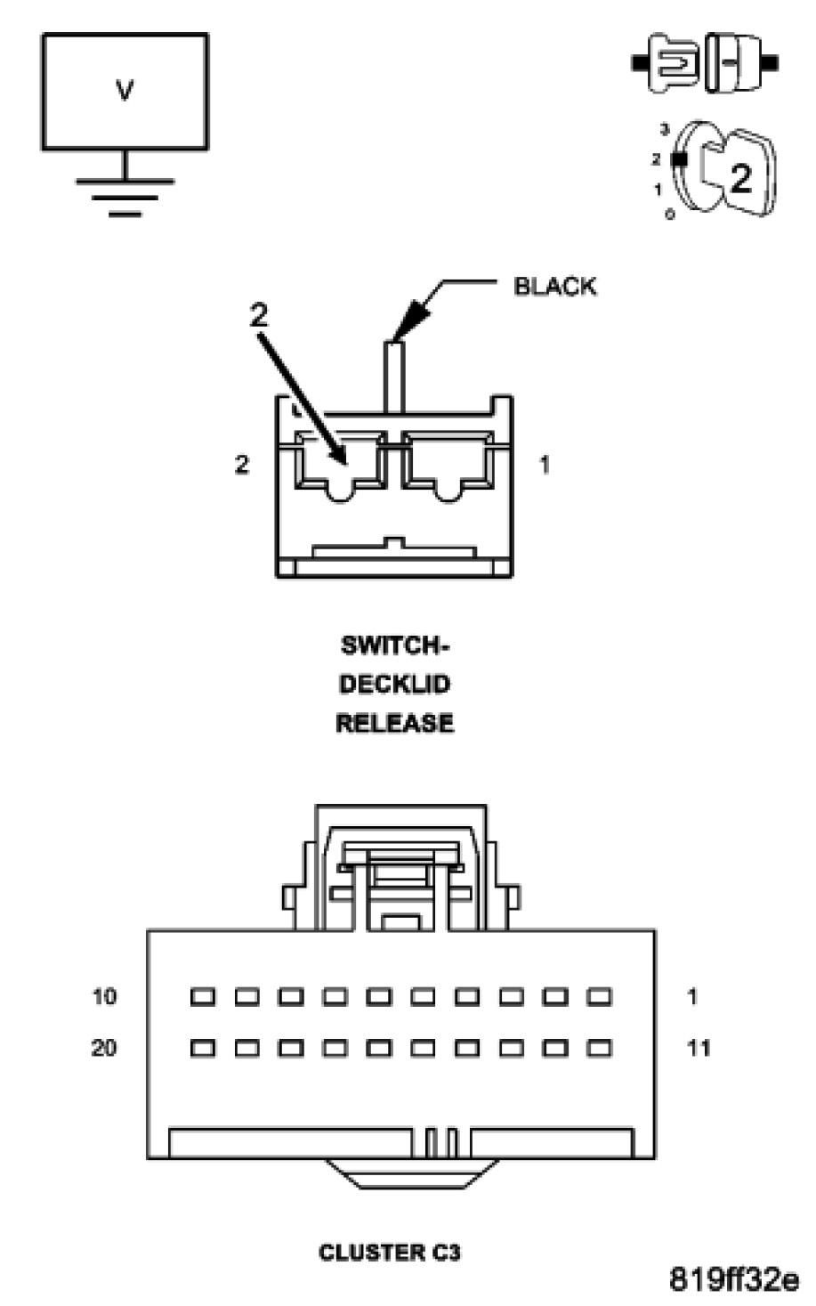 Measure the voltage between Ground and the (P223) Decklid Release Switch sense circuit.