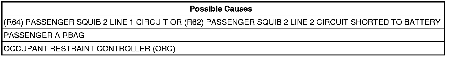 3. CHECK (R64) PASSENGER SQUIB 2 LINE 1 CIRCUIT AND (R62) PASSENGER SQUIB 2 LINE 2 CIRCUIT FOR A SHORT TO BATTERY
