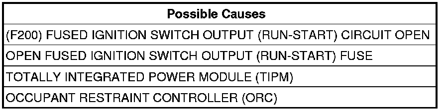 - Repair the open (F200) Fused Ignition Switch Output (Run-Start) circuit.