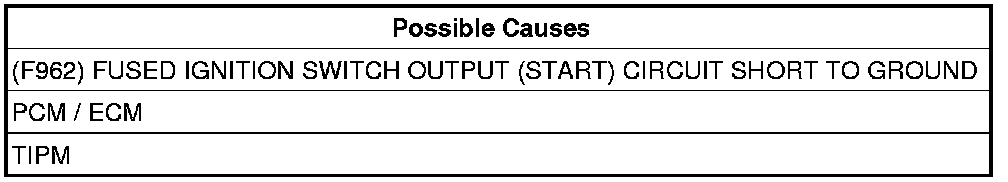 The TIPM detects a short to ground condition in the (F962) Fused Ignition Switch Output (Start) circuit.