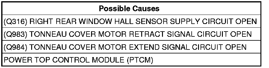 This code will set by the Power Top Control Module (PTCM) when the Convertible Top is activated and the Tonneau Cover Motor power supply is not detected, or the Right Rear Window is activated and the power supply is not detected.