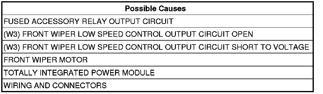 - Repair the (W3) Front Wiper Low Speed Control Output circuit for a short to voltage.