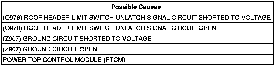 - Repair the (Q978) Roof Header Limit Switch Unlatch Signal circuit for an open.