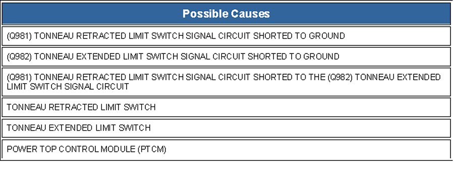 - Repair the (Q981) Tonneau Retracted Limit Switch Signal circuit for a short to the (Q982) Tonneau Extended Limit Switch Signal circuit.