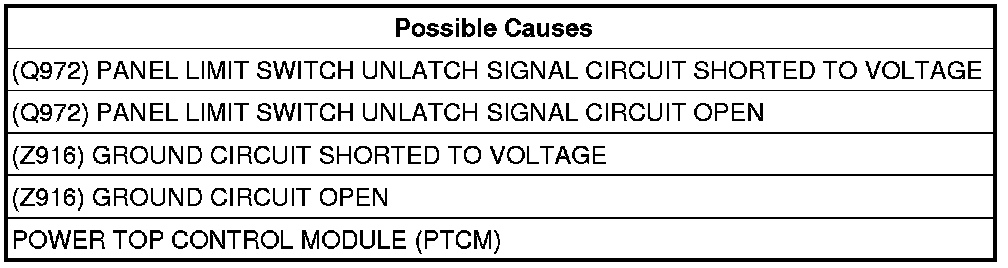 - Repair the (Q972) Panel Limit Switch Unlatch Signal circuit for a short to voltage.