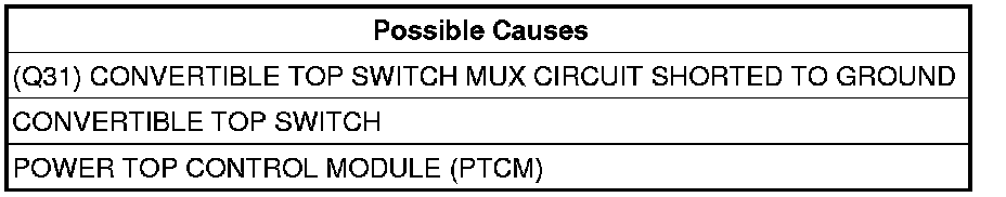 This code will set when the Convertible Top Switch or the (Q31) Convertible Top Switch Mux circuit is shorted to ground for more than 40 ms.
