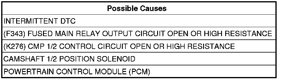 Using a 12 volt test light connected to ground, check the (F343) Fused Main Relay Output circuit in the Camshaft 1/2 Position Solenoid harness connector.