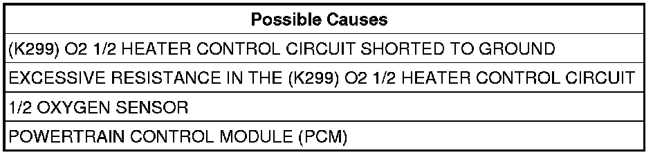 - Repair the short to ground in the (K299) O2 1/2 Heater Control circuit.