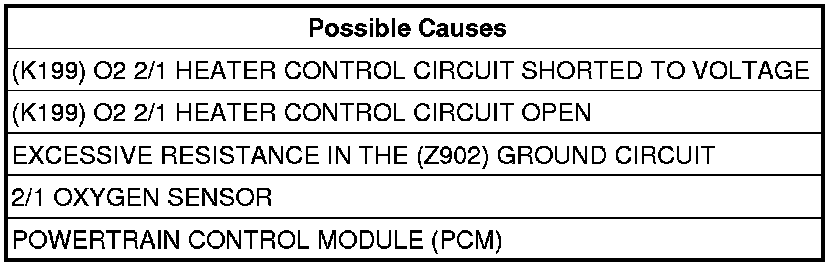 - Repair the short to voltage in the (K199) O2 2/1 Heater Control circuit.