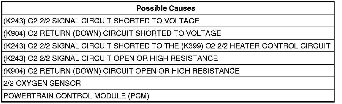 - Repair the short between the (K243) O2 2/2 Signal circuit and the (K399) O2 2/2 Heater Control circuit.