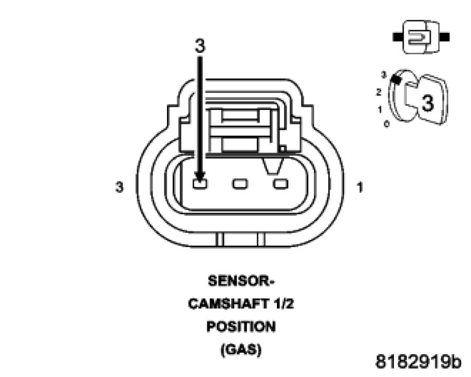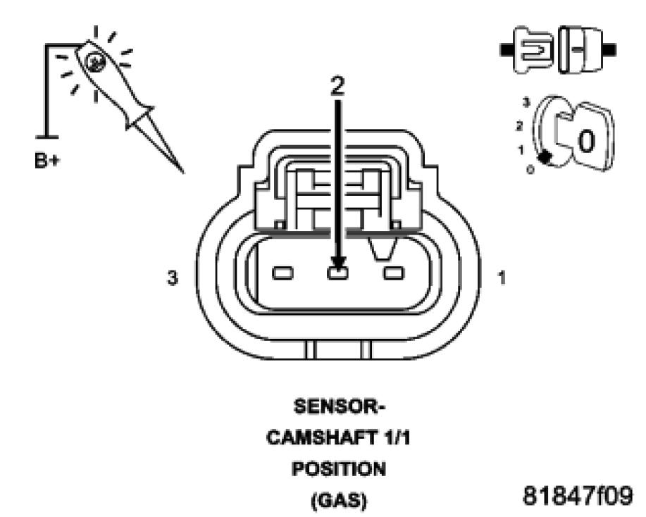 Using a 12 volt test light connected to 12 volts, check the (K900) Sensor Ground in the Camshaft 1/1 Position Sensor harness connector.