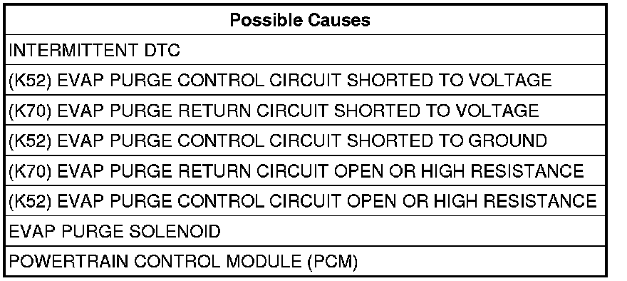 - Repair the (K70) Evap Purge Return circuit for a short to voltage.