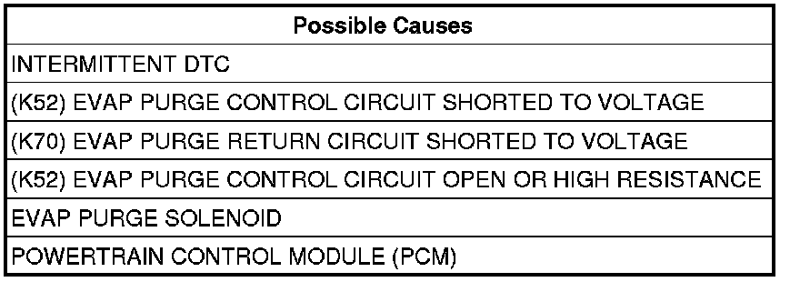 - Repair the (K52) Evap Purge Control circuit for a short to voltage.