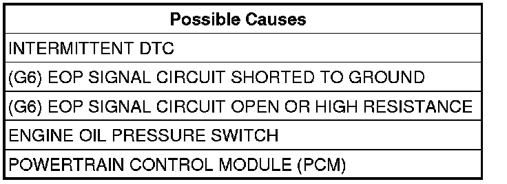 Measure the resistance of the (G6) EOP Signal circuit between the Engine Oil Pressure Switch harness connector and the Powertrain Control Module (PCM) harness connector.