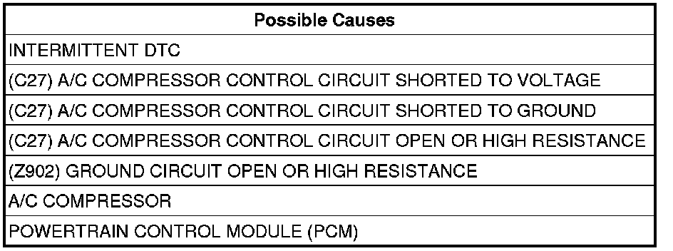 - Repair the (C27) A/C Compressor Control circuit for a short to voltage.