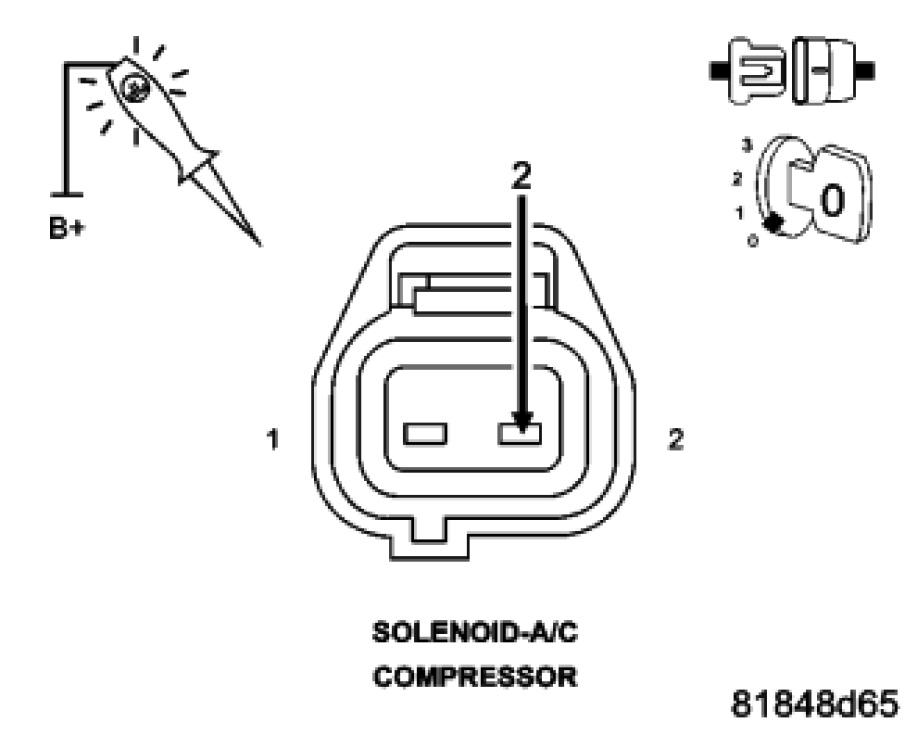 Using a 12 volt test light connected to ground, check the (C27) A/C Compressor Control circuit in the A/C Compressor harness connector.