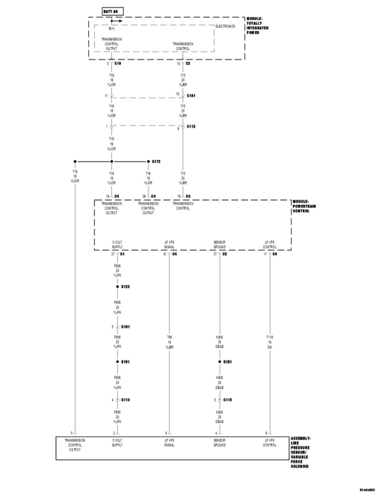 Line pressure is electronically controlled by the Transmission Control System and is measured by the Line Pressure Sensor (LPS). The desired line pressure is continuously being compared to the actual line pressure and is regulated by electronically changing the duty cycle of the Pressure Control Solenoid (PCS). (5% duty cycle = solenoid off = max line pressure, 62% duty cycle = solenoid on = min line pressure).