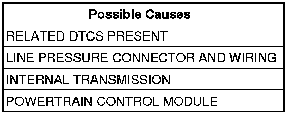 The PCM continuously monitors Actual Line Pressure and compares it to Desired Line Pressure. If the Actual Line Pressure reading is more than 172.4 kPa (25 psi) higher than the Desired Line Pressure, but is less than the highest Line Pressure ever used in the current gear, the DTC sets.