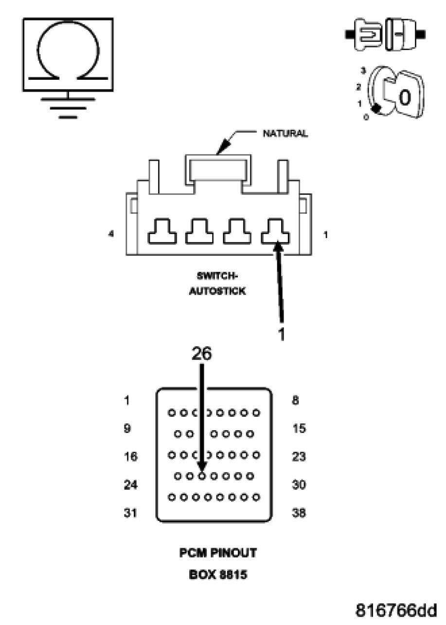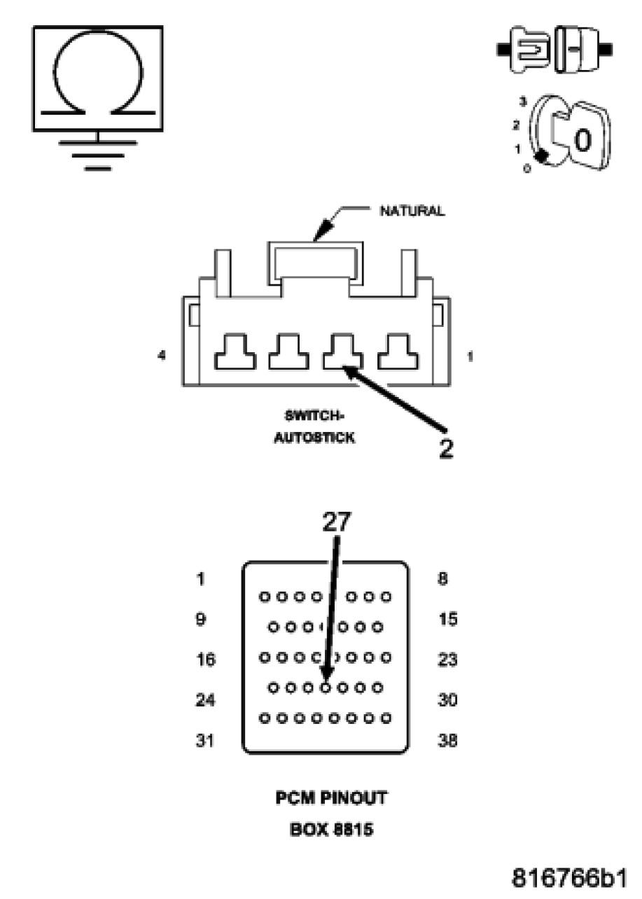 The AutoStick(R) switch contains two hall effect switches connected to ground. The PCM has two separate inputs, upshift and downshift. When the PCM detects an input from the switch, upshift or downshift, it will shift the transmission to the desired gear. If the PCM detects both inputs at the same time, the DTC will set.