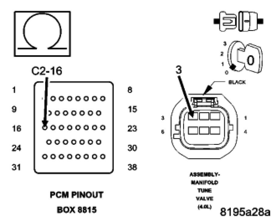 Using the wiring diagram/schematic as a guide, inspect the wiring and connectors between the Manifold Tune Valve Assembly and the Powertrain Control Module (PCM).