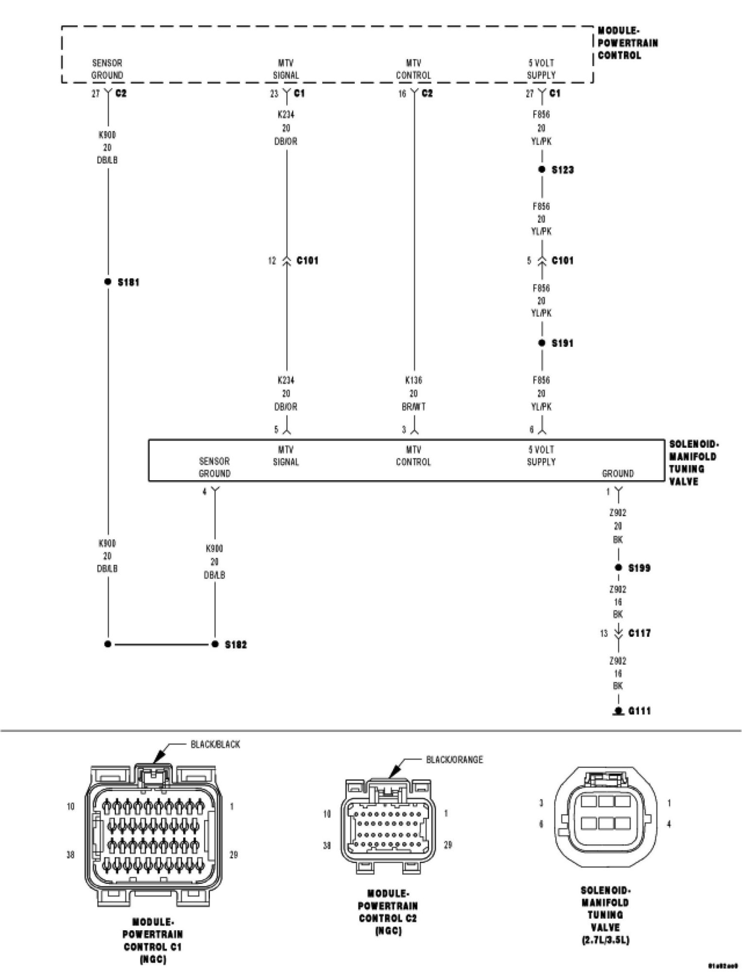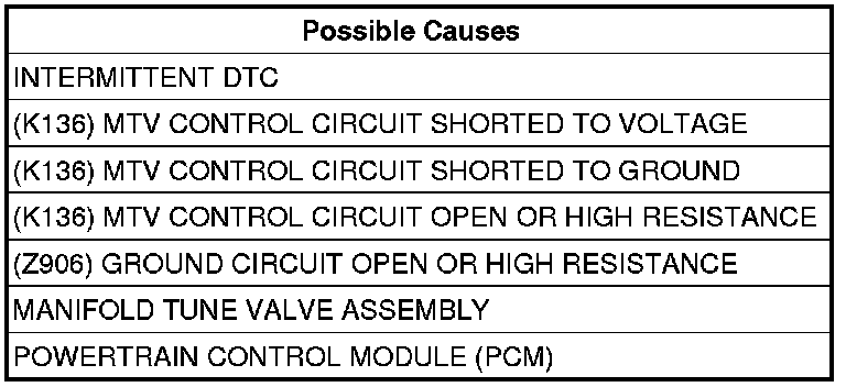 Using a 12 volt test light connected to ground, check the (K136) MTV Control circuit in the Manifold Tune Valve Assembly harness connector.