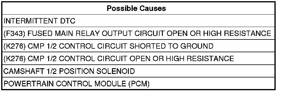 Using a 12 volt test light connected to ground, check the (F343) Fused Main Relay Output circuit in the Camshaft 1/2 Position Solenoid harness connector.