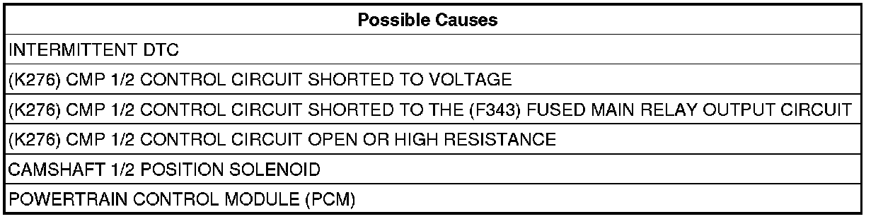 - Repair the (K276) CMP 1/2 Control circuit for a short to the (F343) Fused Main Relay Output circuit.