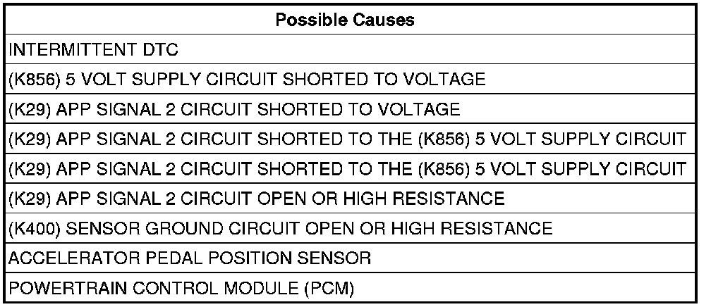- Repair the (K29) APP Signal 2 circuit for a short to the (K856) 5 Volt Supply circuit.