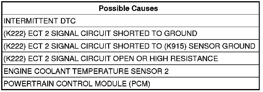 - Repair the (K222) ECT 2 Signal circuit for a short to the (K915) Sensor Ground circuit.