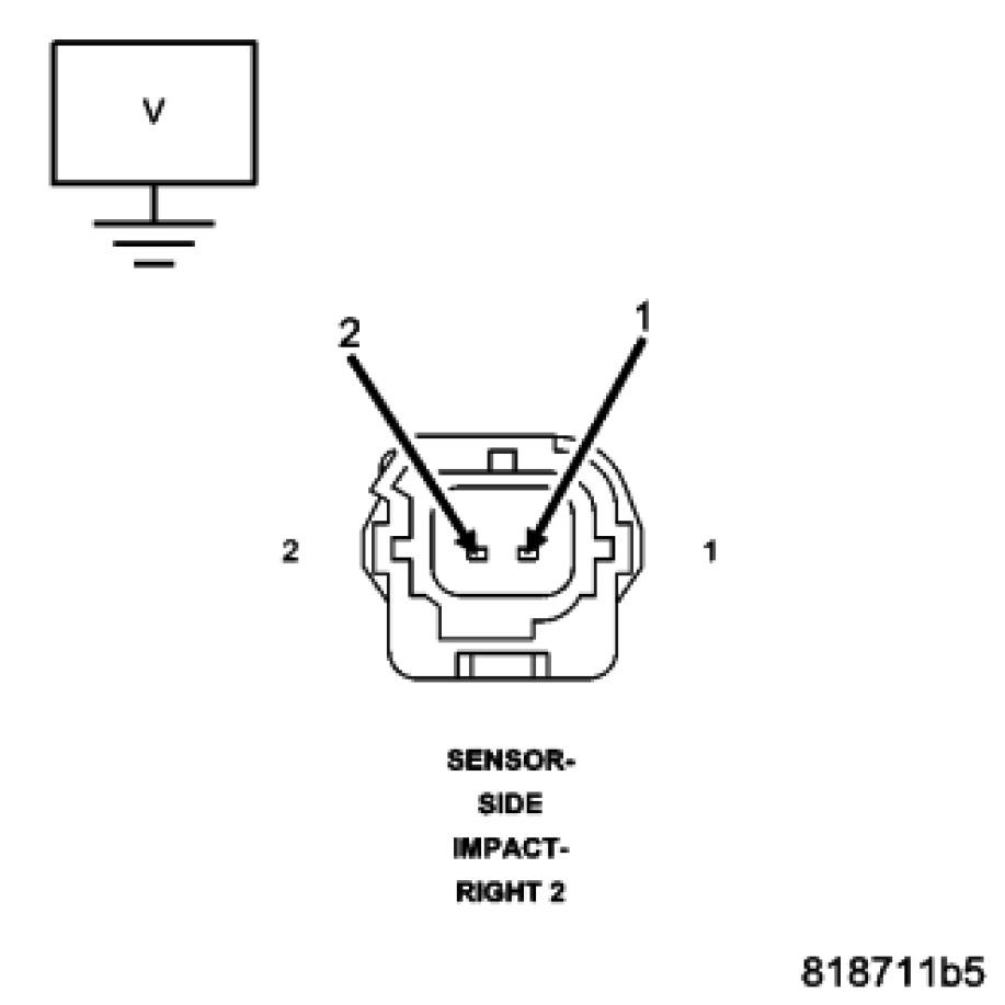 Measure the voltage of the (R18) Right Side Impact Sensor 2 Signal circuit and (R20) Sensor 2 Ground circuit at the Right Side Impact Sensor 2 connector and ground.