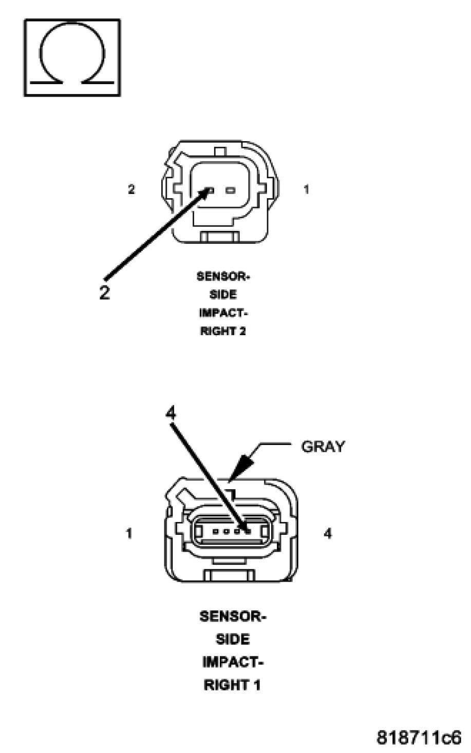 Measure the resistance between the (R18) Right Side Impact Sensor 2 Signal and (R20) Sensor 2 Ground circuits at the Right Side Impact Sensor 2 connector.