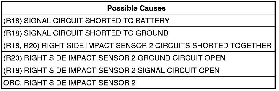 - Repair the (R18) and (R20) Right Side Impact Sensor 2 circuits shorted together.