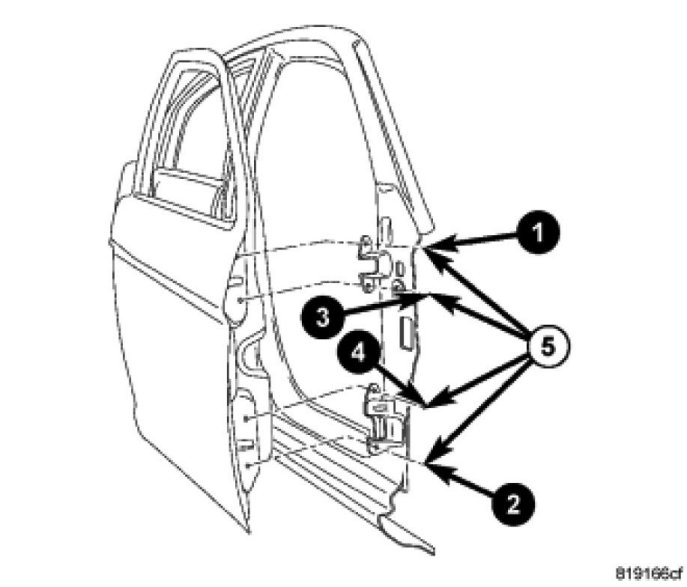 4. Remove the nuts (5) attaching the door to the door hinges and remove the door from the vehicle.