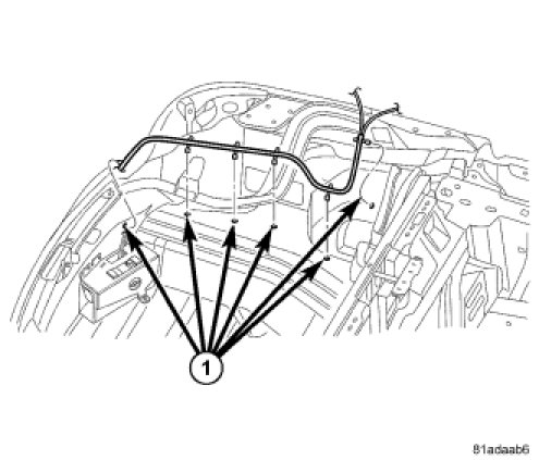 10. Un-clip (1) the line from the trunk area and remove from vehicle.