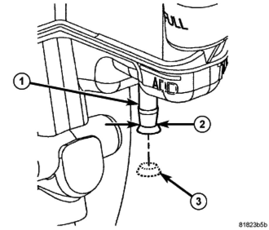6. If equipped with a manual transaxle and a new reservoir is being installed, using an appropriate cutting tool, cut the clutch actuator port at the center of the "V" groove (2) opening the hydraulic clutch port (1). Discard the severed plug (3).