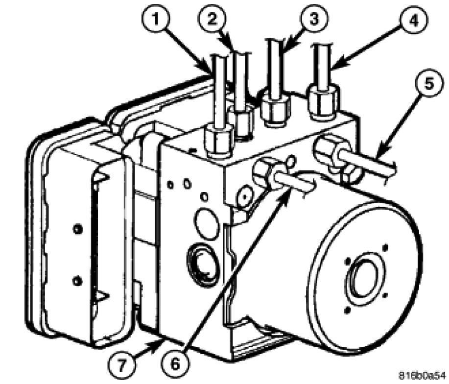 4. Install the four chassis brake tubes (2, 3, 5, 6) brake tubes at the ICU hydraulic control unit (7). Tighten the tube nuts to 17 Nm (150 in. lbs.).