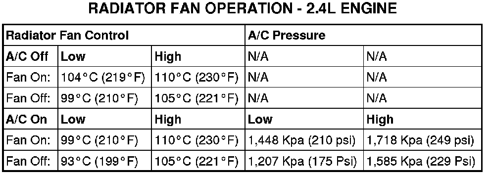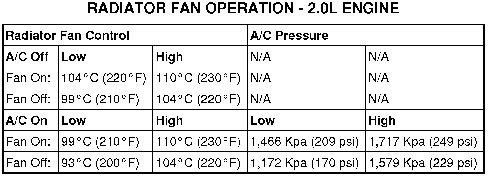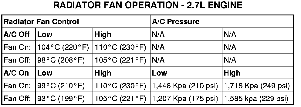 Fan control is accomplished three ways. The fan runs when the air conditioning pressure reaches a set pressure, refer to RADIATOR FAN OPERATION chart. In addition to this control, the fan is turned on by the temperature of the coolant which is sensed by the coolant temperature sensor which sends the message to the Powertrain Control Module (PCM). The PCM turns on the fan through a fan relay. On models equipped with automatic transmission, a transmission fluid thermister may have some influences on fan operation. See Wiring Diagrams Manual for circuity and diagnostics provided.