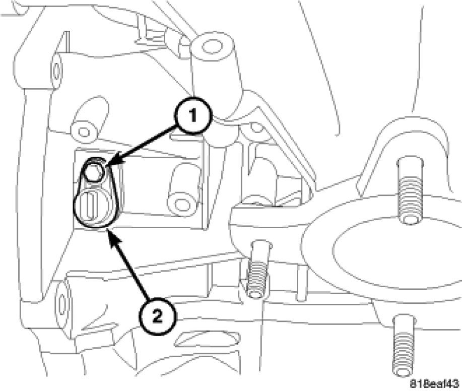 16. Remove crankshaft position sensor retaining bolt (1) and remove sensor (2).