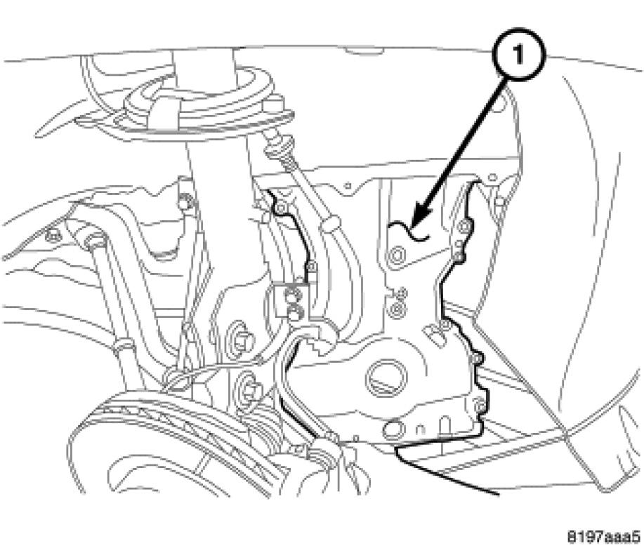 32. Remove timing chain cover (1) out through the bottom of the vehicle.