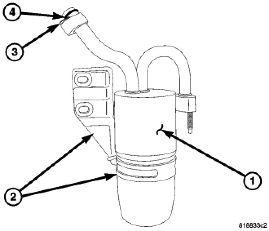 The A/C accumulator is mounted below the engine compartment behind the right side of the front fascia. A band and mounting bracket (2) secures the A/C accumulator to the right front frame rail and the connections are sealed by use of metal gaskets (3) and rubber O-rings (4).