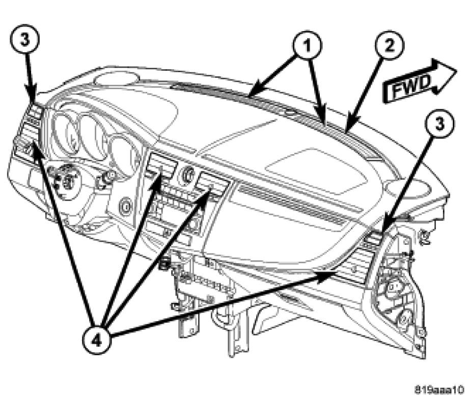 There are two side window demister air outlets (3). One located on each end of the instrument panel. The airflow from the side window demister air outlets is directed by fixed vanes and cannot be adjusted. On Chrysler models, the side window demister air outlets are serviced with the outer instrument panel air outlets Air Outlets - Removal. On Dodge models, the side window demister air outlets are not serviceable from the instrument panel top pad Instrument Panel Pad - Removal.