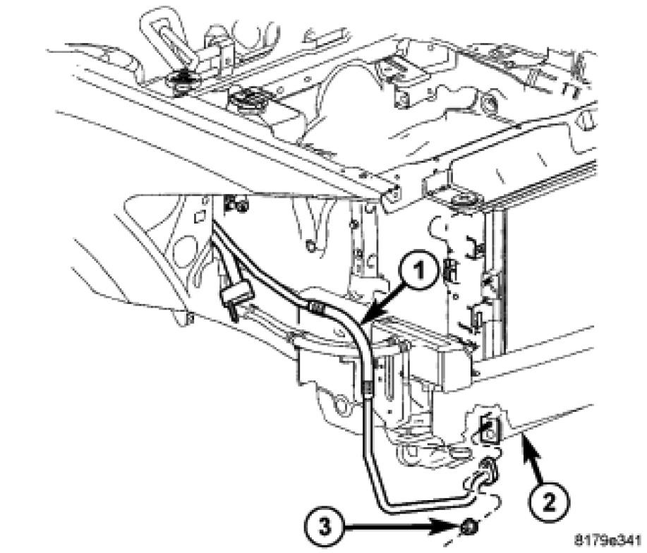 14. Reach up through the opening in the bottom of the front fascia and connect the A/C liquid line (1) to the A/C condenser (2) and install the retaining nut (3). Tighten the nut to 25 Nm (18 ft. lbs.).