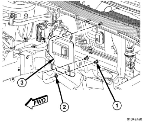 9. Position the heat shield (3) onto the three studs (1) located on the dash panel in the engine compartment.