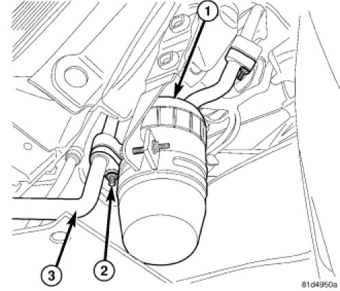 5. Install the bolt (3) that secures the A/C liquid and suction line assembly to the A/C evaporator. Tighten the bolt to 25 Nm (18 ft. lbs.).