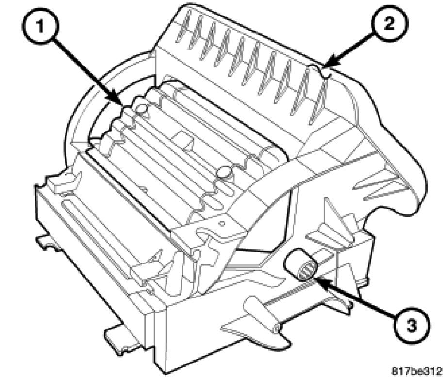 1. Carefully install the recirculation-air door (1) into the air inlet housing (2) by pinching the two ends of the air-door together and aligning the pivot shafts of the air-door to the pivot shaft holes in the air inlet housing.