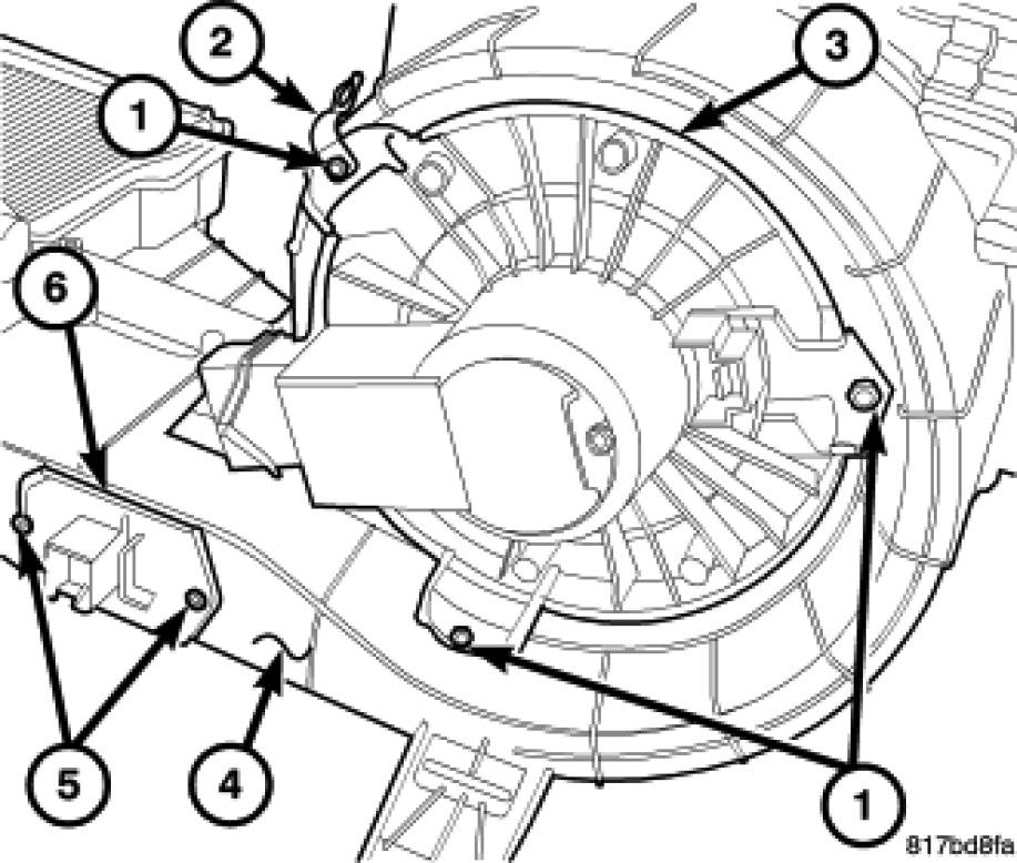 5. Remove the two screws (5) that secure the blower motor resistor or power module (6) to the bottom of the HVAC housing and remove the resistor or power module.