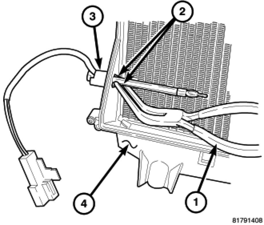 6. Using needle nose pliers (1), disengage the two retaining tabs (2) that secure the evaporator temperature sensor (3) to the driver side of the HVAC housing (4) and remove the sensor.