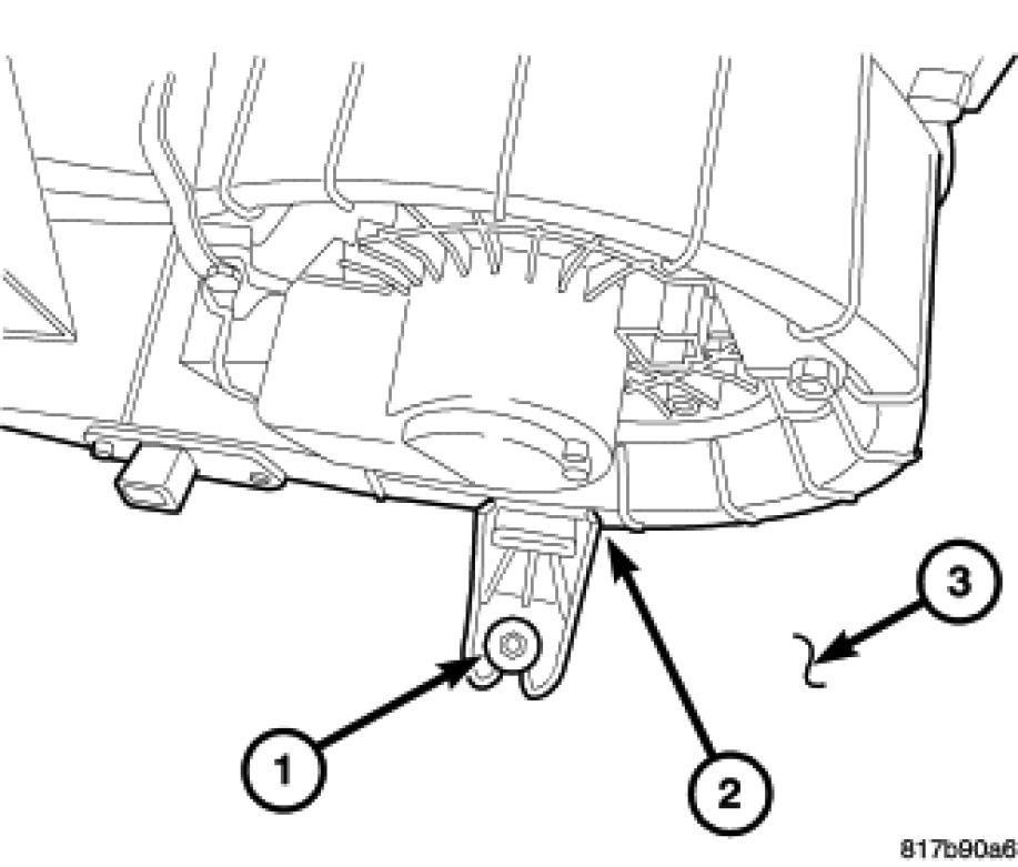 1. Position the HVAC housing assembly (2) to the dash panel (3). Be certain that the passenger side of the HVAC housing is correctly located over the dash panel mounting stud.