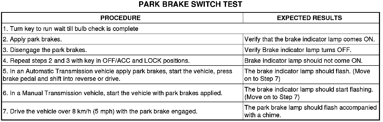 The brake/park brake indicator illuminates when the parking brake is applied with the ignition switch turned to the ON position (Refer to the PARK BRAKE SWITCH TEST table). The same lamp will also illuminate if one of the two (hydraulic or ABS) service brake systems fail when the brake pedal is applied.