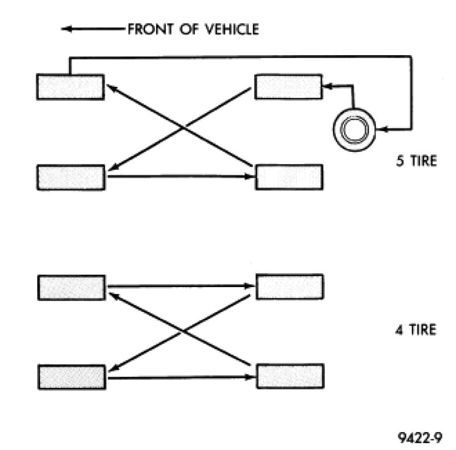 The suggested method of tire rotation is shown in this graphic. Other rotation methods can be used, but they will not provide all the tire longevity benefits.